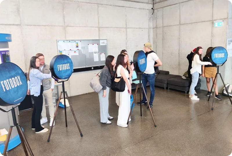 Gäste betreten den Stand, um ihr Foto abzuholen